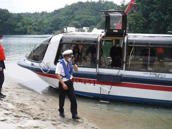 鉦ケ淵の砂浜への緊急接岸後、乗客の砂浜への脱出、恵那警察署と恵那市消防局のボートによる砂浜からの救助の訓練を行ました。 -